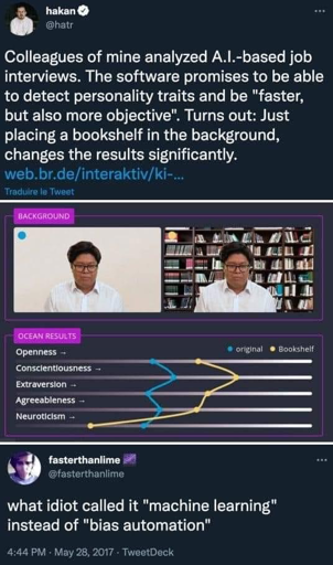 Reminds me of an early application of AI where scientists were training an AI to tell the difference between a wolf and a dog. It got really good at it in the training data, but it wasn’t working correctly in actual application. So they got the AI to give them a heatmap of which pixels it was using more than any other to determine if a canine is a dog or a wolf and they discovered that the AI wasn’t even looking at the animal, it was looking at the surrounding environment. If there was snow on the ground, it said “wolf”, otherwise it said “dog”.