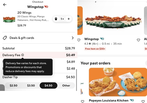 I am almost 100% sure that before I clicked on Wingstop and added things to my cart that delivery fees were listed on the page, and that Wingstop was listed as having no fee.