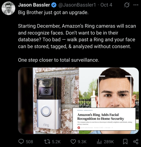 Starting December, Amazon’s Ring cameras will scan and recognize faces. Don’t want to be in their database? Too bad — walk past a Ring and your face can be stored, tagged, & analyzed without consent.
