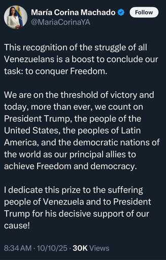 This is building consent for a US war on Venezuela. Nobel war prize more like, considering the people they award this to.