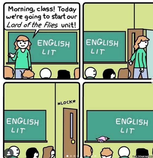 I both dislike the book and dislike this comic for missing the actual point of the book, which is not in fact, haha, this is what would actually happen and it’s just a group of random kids. It was specifically portraying british aristocratic children to criticize the colonizer mindset while discussing larger issues of human nature and civility and structure vs chaos.