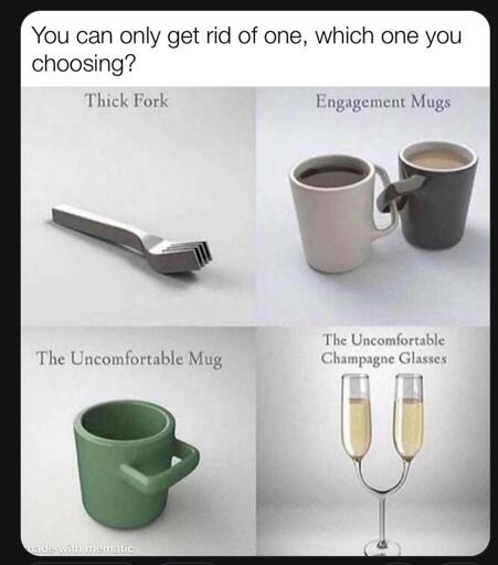 minus-squareRedditWanderer@lemmy.worldlinkfedilinkarrow-up1·1 year agoObviously the mugs. I can fill only one of those champaign glasses and still have a functional glass. A mug hanging on the handle of another, no matter which is filled, is arguably the least convenient item here