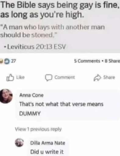 I get the joke but I’m not sure the Bible actually says those words “a man who lays with a man should be stoned”. I know it says men shouldn’t lay with men.