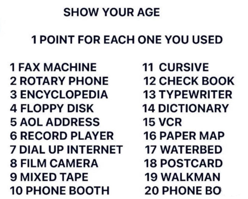 Terrible distribution of options. A good list would have a series of technologies and tools that became obsolete at different times. Almost all of these became obsolete with the rise of broadband internet in the early 2000’s, while a handful were earlier (rotary phones) or later (paper maps, paper checks).