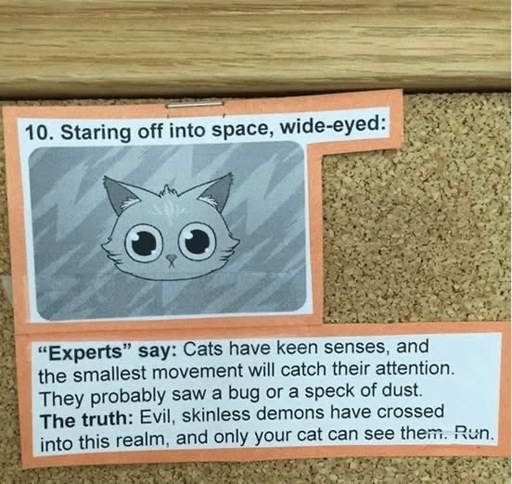 Every night while I’m on my computer, my cat sits on the desk beside me. Occasionally, she sits up and stares, wide-eyed, just over my shoulder and up a little. The house is silent. What the actual … ?!