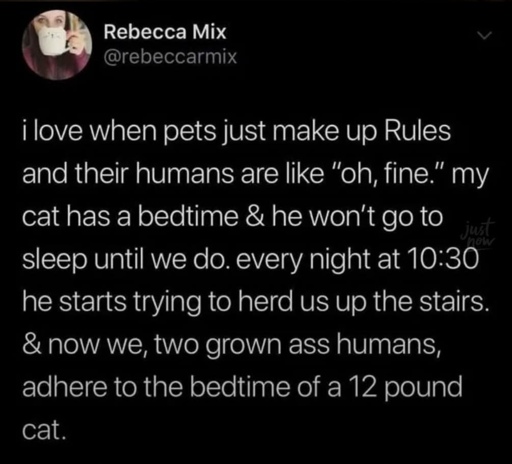 My cat also has a very healthy bedtime, but I’m a night owl. So I’ll turn the lights off after 10pm, light up small LED candles, let my cat sleep on my lap, and try not moving too much. After sometime I’ll have to wake her up, then we go cuddling together under the duvet. She’ll get up early without waking me up. The best friend I ever have.