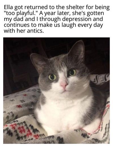 One of our cats was a twice-returned. Shelter staff said previous adoptive parents complained he was too playful. We got him home like 7 years ago and this guy has been the definition of chill ever since.