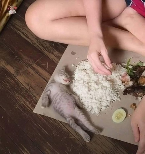 Looks like nasi lemak, so the picture could be from Indonesia or Malaysia. Posters here reacting to someone eating while sitting on the floor: the majority of human civilization does it. How about respecting the fact that there are other cultures than your own? Maybe the kitten had fallen asleep on the photographer’s lap and they just placed it there for a cute photo.