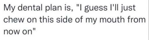 Dental insurance: “Hahahaha! Fuck you! The maximum we’ll pay for your care in a year is $XXX! Also, we don’t cover anything other than cleanings!”
