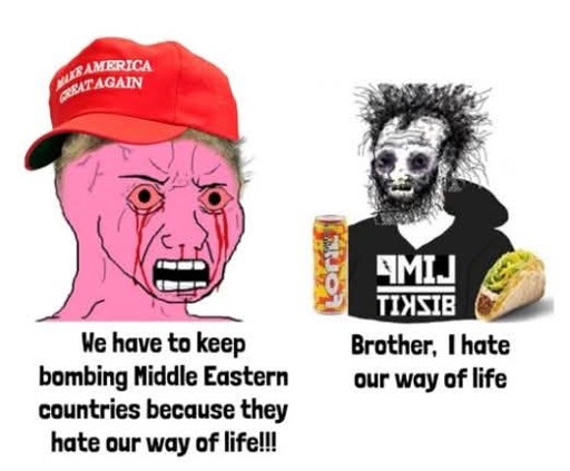 To them, the American way of life should be akin to the Iranian way of life, except instead of a form of ultra conservative Shia Islam and a personality cult around the Ayatollah, it’s a form of Ultra Conservative Evangelical American Christianity, a form of absolute pseudo-monarchy based around Trump and his family, nationalism wherein the founding fathers are Demi Gods, and a landscape where one very specific form of white American culture is the only culture allowed.