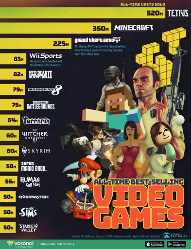Does GTA V equate to selling one playable copy or is it because its somehow bundled with shark cards? Also how is Tetris counted, because there are multiple Tetris games. Do they count smartphone games? How fits free to play with micro transactions into this discussion? Some have a buy once for full price to unlock main game with additional optional DLCs (in example Overwatch 2 and Paladins worked like that). It’s a bit unfair to put them all in one. I also do not count built-in or bundled games like Wii Sports.